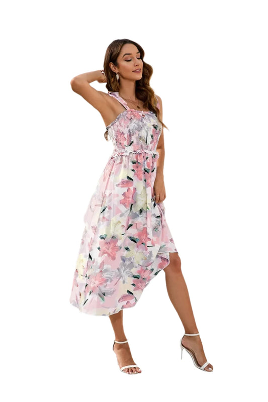 Smocked Printed Square Neck Midi Dress – Feminine Style with Tie Detail