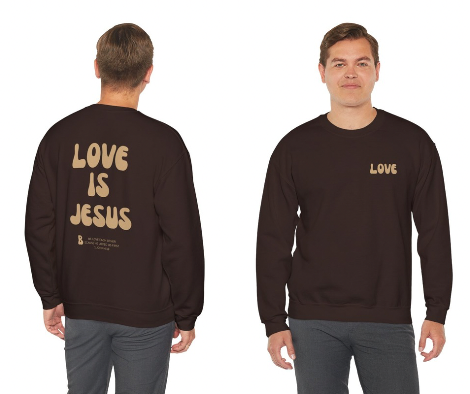 Cozy Love Is Jesus crewneck sweatshirt. Perfect faith-based gift for Valentine's Day, Christmas & everyday wear. Inspirational Christian apparel for him & her.