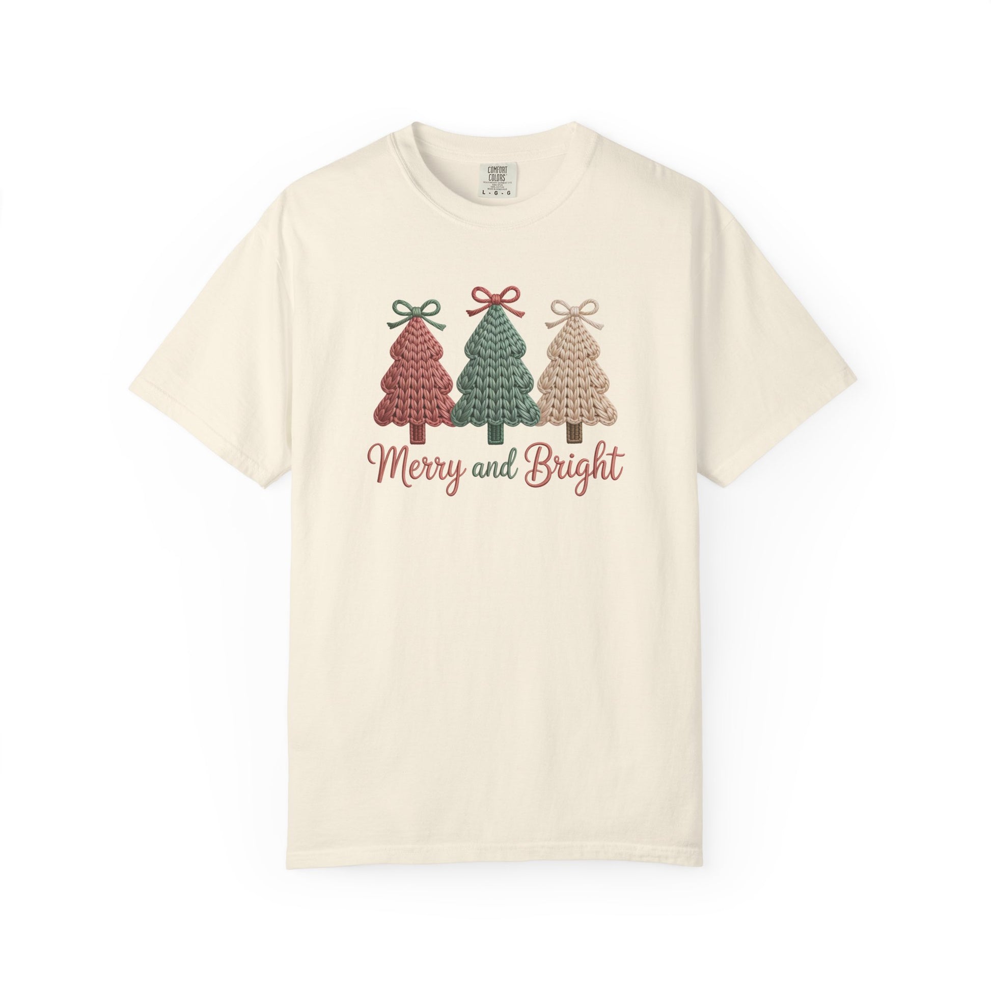 Capture the gentle spirit of the holidays with the Merry and Bright Knit Trees T-Shirt. Featuring three knit-texture Christmas trees topped with delicate bows and a hand-lettered “Merry and Bright” sentiment, this tee evokes the warmth of a holiday postcard. Made from 100% ring-spun US cotton with a garment-dyed finish, it offers a soft, vintage-style texture and muted colors that create a lived-in, cottage feel. The relaxed fit and medium-weight fabric drape comfortably for layering or solo wear, making it ideal for sipping hot cocoa, decorating, or cozying up by the fire. Available in a wide range of colors and sizes, this tee blends festive charm with everyday comfort.